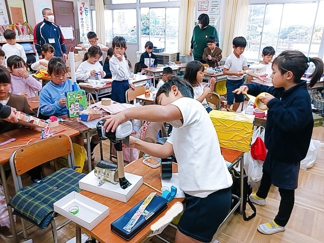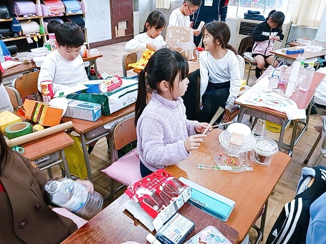 図工「音づくりフレンズ」で、身の回りのものを使って楽器づくりをしています。作ったら音を確かめ、その音のイメージから飾り付けをしていきます。