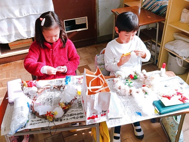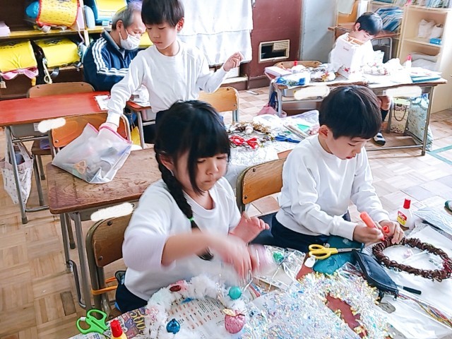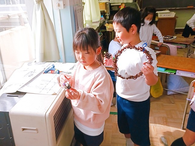図工で、クリスマスリースを作っています。飾りで使うものを準備し、工夫して飾り付けをしています。