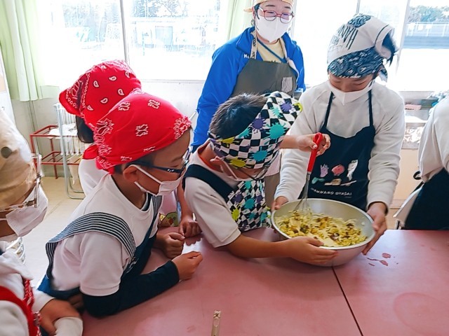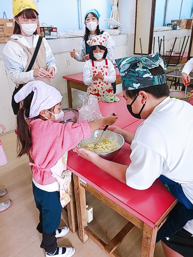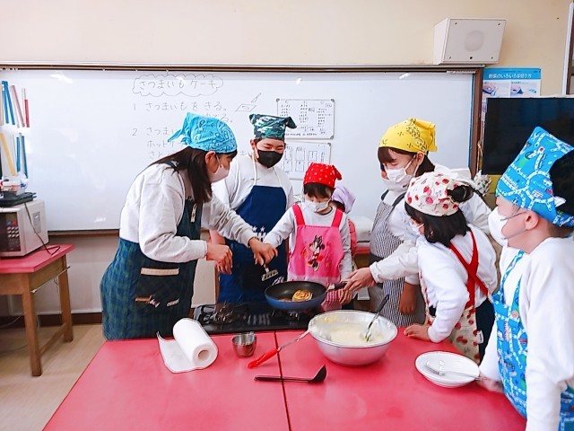 高学年子供たちがさつまいもを切ってゆでました。低学年子供たちは、ホットケーキの下地にゆでたさつまいもをつぶしながら混ぜています。