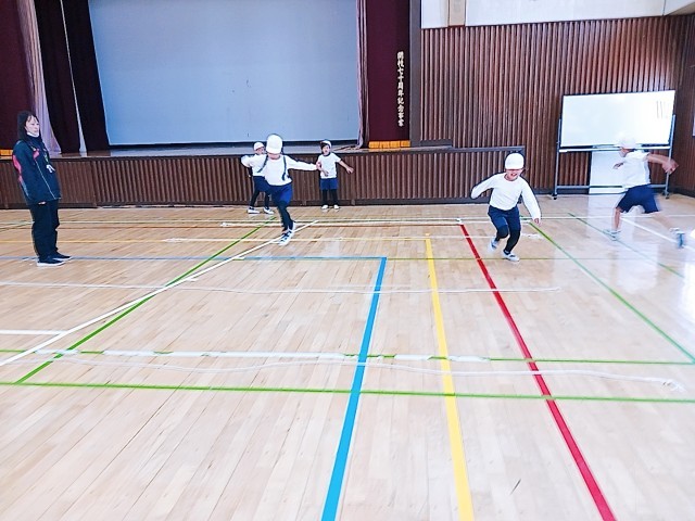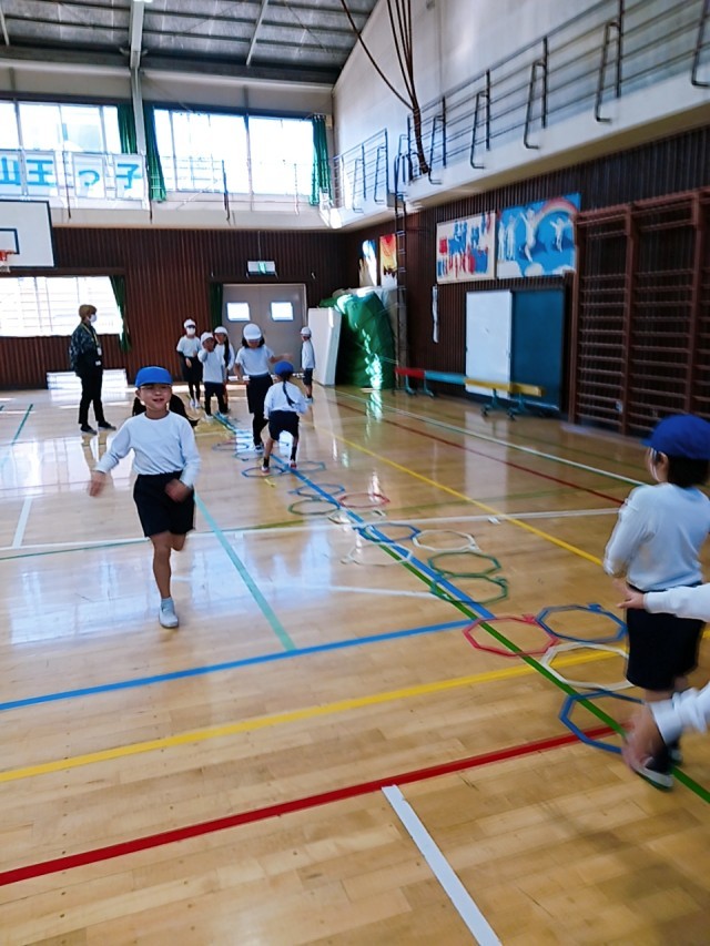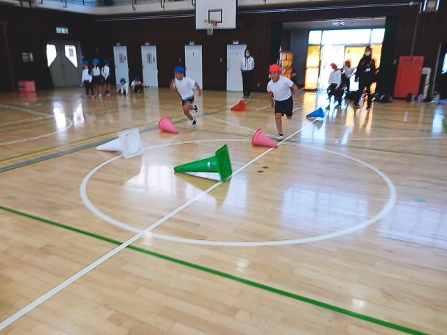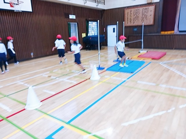 けんけんパーじゃんけん・コースきょうそう・ゴムとび(かえる・うさぎ・カンガルー)・川とび(川に落ちるとわにに食べられてしまう想定)に取り組んでいます。子供たちは繰り返し行い、楽しそうです。コースきょうそうは、カラーコーンなどを越えるのにリズムよく走っています。川とびは、川幅を変えながら工夫して取り組む様子が見られます。