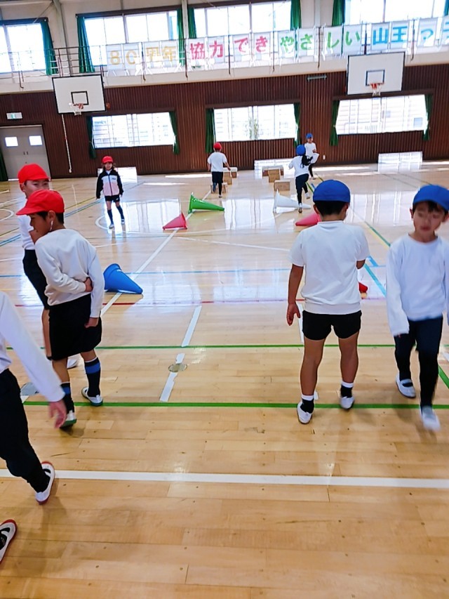 3校時は体育です。体育館に「ぴょんぴょんランド」を作って、跳ぶ運動を行っています。