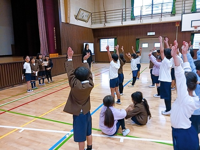 2年生は、花丸100パーティーを体育館で行いました。命令ゲームをしているところです。雨でドロけいができなくなり、ドッジボールを楽しみました。