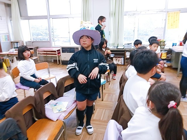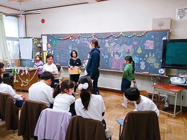 3年生は、クリスマスパーティーでプレゼントタイムです。係の人が折り紙でサンタを作り、全員に渡していました。
