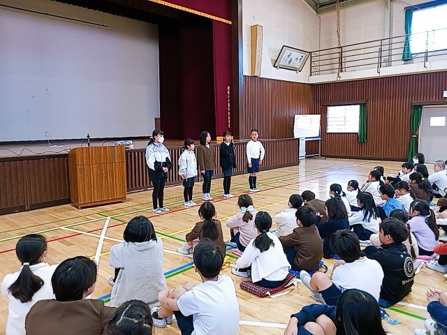 3年生が、1月から3月までの生活目標「感謝の気持ちを表そう」の取り組みについて発表しました。校務用員さんをはじめ、日頃お世話になっている方に自分からあいさつやありがとうの声をかけること、振り返りを行いしっかり取り組めるようにすることを伝えました。