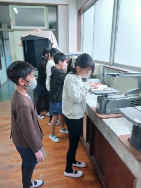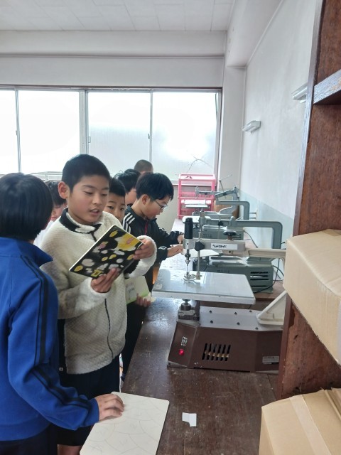 描いた絵に絵の具で色を塗り、ニスで仕上げた後に、電動糸のこを使って、板を切り分けています。糸のこを上手に使って、線に添って切っています。
