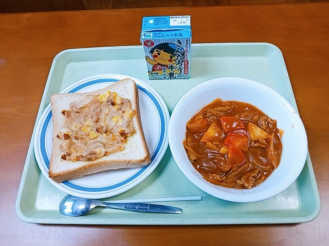 今日の献立は「牛乳・ツナコーントースト・トマトシチュー」です。