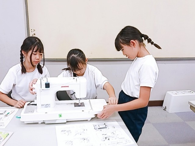 家庭科でミシンの使い方の学習です。縫い始めるまでの上糸のかけ方や下糸の入れ方を学んでいます。はずみ車を回しながら下糸を引っ張り出す作業も難しかったようです。友達と協力しながら、一人一人が自分でできるように頑張っていました。
