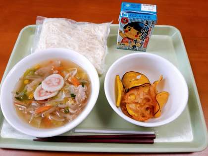 今日の献立は、「牛乳・しおラーメン・こんさいチップス」です。