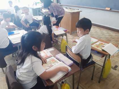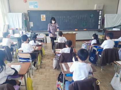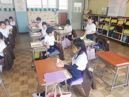 ひらがな「す」の学習の後、「はなのみち」を読みました。くまさんやりすさんが思っていることを考えました。ペアで話し合うと手を挙げる人がぐっと増えて発表していました。