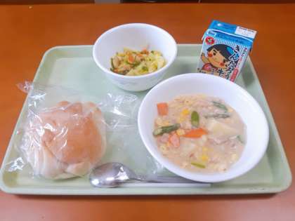今日の献立は、「牛乳・こめこロールパン・アスパラのクリームスープ・キャベツのセサミソテー」です。