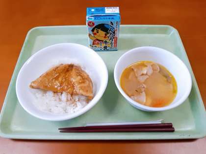 今日の献立は、「牛乳・あじのかばやきどん・とんじる」です。