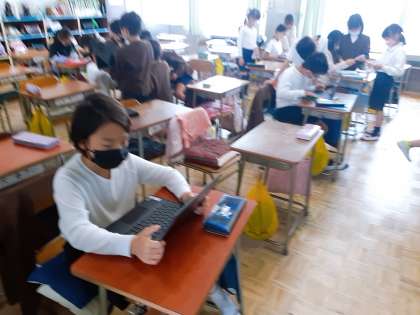 クロムブックを使っている人が多かったです。3年生の廊下には、アゲハの幼虫がいて、成長の様子を動画で見たよという人もいました。