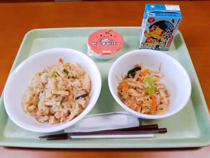 今日の献立は、「牛乳・たきこみさんさいおこわ・きりぼしだいこんのナムル・ピーチゼリー」です。