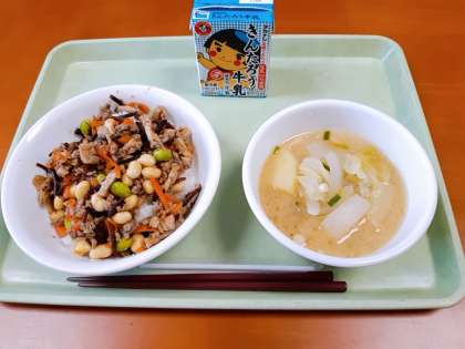 今日の献立は、「牛乳・ごもくひじきごはん・しもなかたまねぎのみそしる」です。