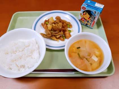 今日の献立は、「牛乳・ごはん・☆チキンチキンごぼう・みそしる」です。