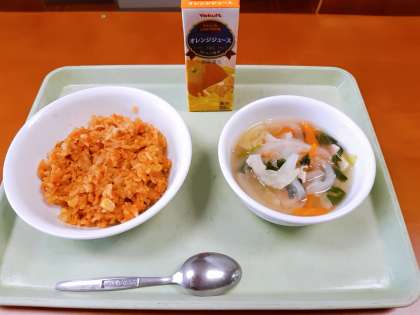 今日の献立は、「オレンジジュース・チキンライス・コンソメスープ」です。