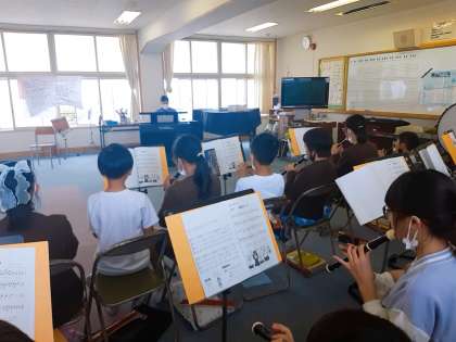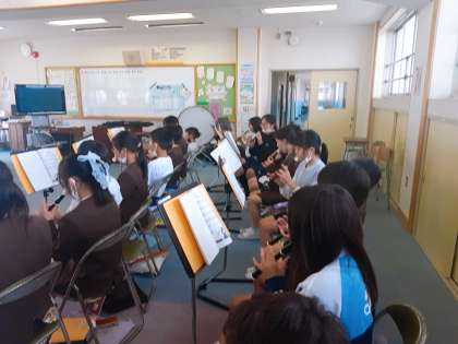 「笑点のテーマ」の曲をリコーダーで演奏していました。1回目は、ゆっくり。2回目は、テンポアップして。その後、「吹きたい人?」の教師の声かけで5人が演奏しました。積極的に取り組むよさ、温かい聴き方ができるよさを感じました。