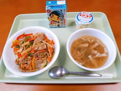 今日の献立は、「牛乳・チンジャオロースどん・ちゅうかスープ・ヨーグルト」です。