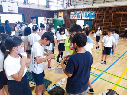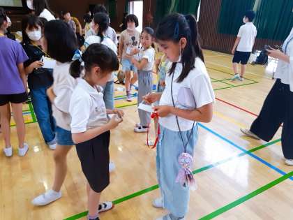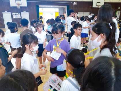 川村小の人が自分の名札の裏に、仲よくなった子に名前を書いてもらっています。「書いて。」と言われて嬉しそうです。笑顔の時間です。