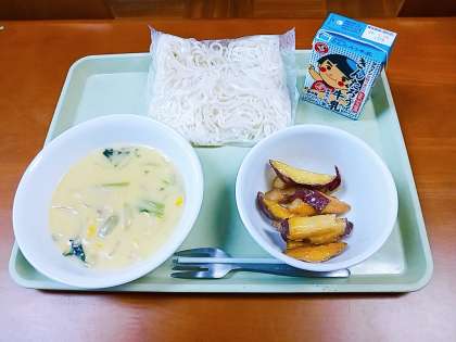 今日の献立は、「牛乳・ソフトめん・コーンクリームソース・キャラメルミルクポテト」です。