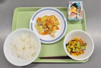 今日の献立は、「牛乳・こめこパン・あげどりのチリソース・イタリアンスープ・ブルーベリータルト」です。