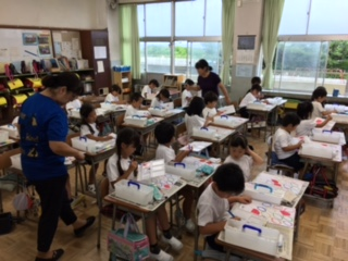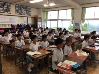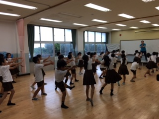 今日は、残念ながら雨。雷も鳴りました。体育館の照明工事の足場はとれましたが、もう少しの間は使えません。そんな雨の日の3時間目終わり近くに教室をまわりました。1年生は不透明水彩絵の具の使い方を覚えていました。今までクレヨンでしたが絵の具のなめらかな塗り心地に新鮮な驚きを味わっていました。2年生は多目的ホールでダンスの練習、元気いっぱいです。このポーズは何でしょう?運動会が楽しみです。3年生はちょうど加賀先生の「終わります」を受けて、日直が「姿勢を正して!」と号令をかけたところです。みんないい姿勢ですね。