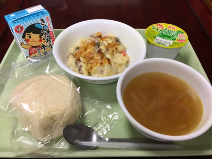 今日の献立は “ ぎゅうにゅう しろパン グラタン オニオンスープ マスカットゼリー ” です。