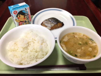 今日の献立は “ ぎゅうにゅう ごはん さわらのピリからやき かぼちゃとベーコンのみそしる ” です。