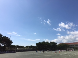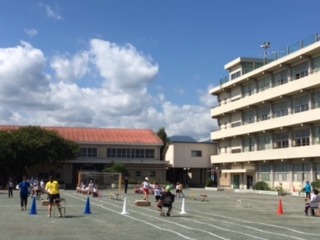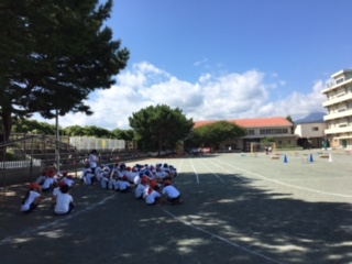 松の日陰がちょうど2つあって入れ替えながら練習するのにはもってこいです。児童会種目2つ目は、日頃、着替えを自分でサッサとしているかわかる内容です。