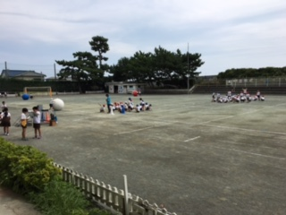 1・2年生はなかなか合わず何度も繰り返して練習しています。今日は後半は大玉転がしの練習です。玉と一緒に転がっていませんか?洗濯がたいへんそうな人もいますね。