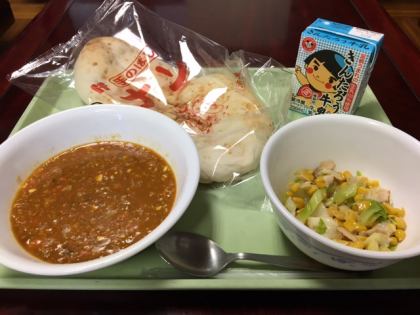 今日の献立は “ ぎゅうにゅう ナン キーマカレー カラフルソテー ” です。