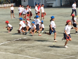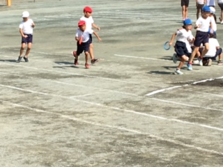リレーの練習です。日に日にバトン(輪っか)パスが上手になっています。いかに声を出してしっかり渡せるかですね?