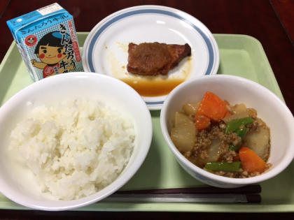 今日の献立は “ ぎゅうにゅう ごはん ぶたにくのうめおろしソース だいこんのピリからに ” です。