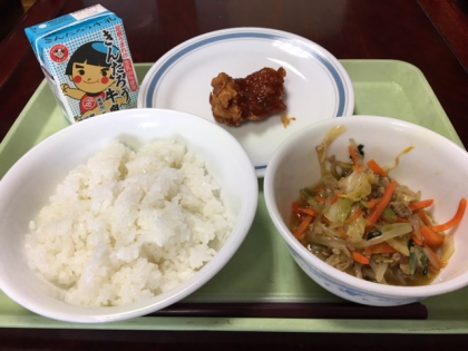 今日の献立は “ ぎゅうにゅう ごはん あげどりのチリソース もやしのちゅうかいため ” です。