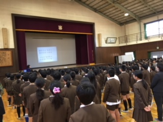 寒いので、からだがちじこまっています。加賀先生の合図で肩や首を回してほぐしてから「はじめのいっぽ」を元気よく歌いました。