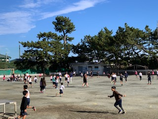 縦割り班で遊ぶ昼休みです。相談をしている班、ドッジボールをする班、ドロ警をする班、様々です。