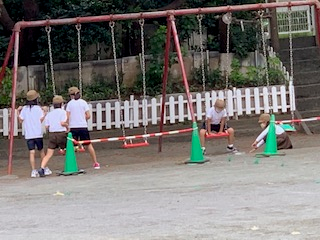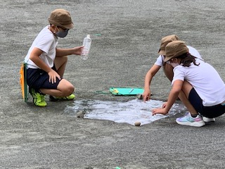 1時間目が始まりしばらくするとグランドから声が聞こえてきます。4年生が理科の単元「雨水のゆくえ」の実験に出てきました。
