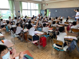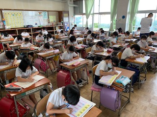 3年生も国語です。漢字の書き順をみんなで練習してから、ドリルで練習です。