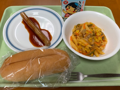 今日の献立は “ ぎゅうにゅう ホットドッグ マカロニソテー ” です。
