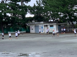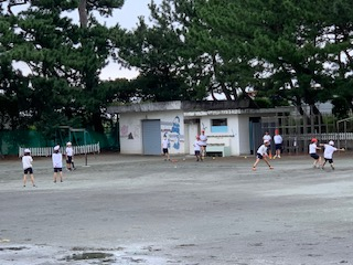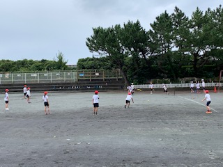 5年生が取り組むベースボール型ゲームのTボールは、台風の風雨を心配しましたが、元気に取り組んでいます。