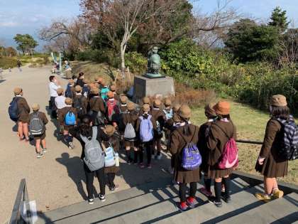赤い靴の女の子の像です。高井さんの説明に聞き入ります。日本平の位置がよくわかる模型です。