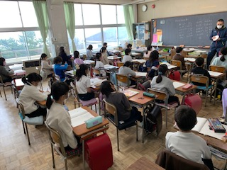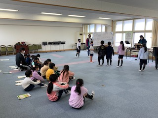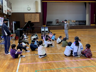 1年生は体育館で「6年生を送る会」のリハーサルの反省をしています。一人ひとりが自分のことと全体のことについて発言しています。