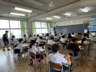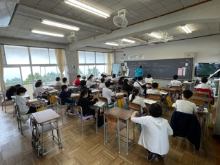5年生は外国語です。映像を使ってリズム感のある会話をみんなで確認しています。
