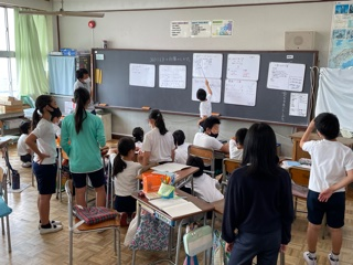 5年生も算数です。360÷1.8の計算の仕方についてグループで話し合い発表しています。