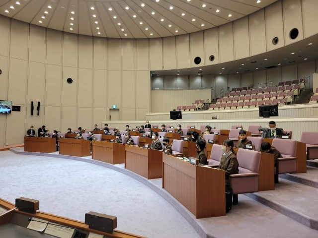 子どもたち全員議員席に着席しました。学習が始まります。