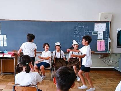 お楽しみ会で創作劇の発表をし、みんなで楽しんでいます。トトロの劇とまんたろうの劇です。一人一人がはずかしがらずに演技する様子を見て、安心して表現できるクラスが作られているのだと感じました。