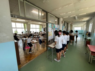 1年生は朝の会です。提出物の確認をしています。毎日出すものは出せていますか?社...