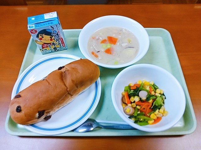 今日の献立は「牛乳・ぶどうパン・さつまいものクリームシチュー・こまつなとハムのソ...