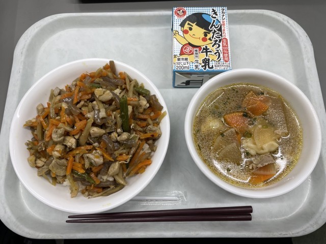 【献立】牛乳 鶏ごぼうごはん(さくらめし) すいとん