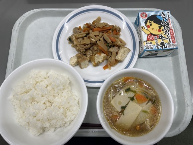 今日の給食は、中華料理献立でした。ジャーチャン豆腐は「常家豆腐」と書き、「常に家にある材料で作られる豆腐料理」という意味があります。豚肉と玉ねぎやにんじんなどの野菜を炒め、厚揚げと高野豆腐を加えて仕上げました。高野豆腐を加えることで、野菜のうまみや栄養を含んだ汁気も逃さずいただくことができます。